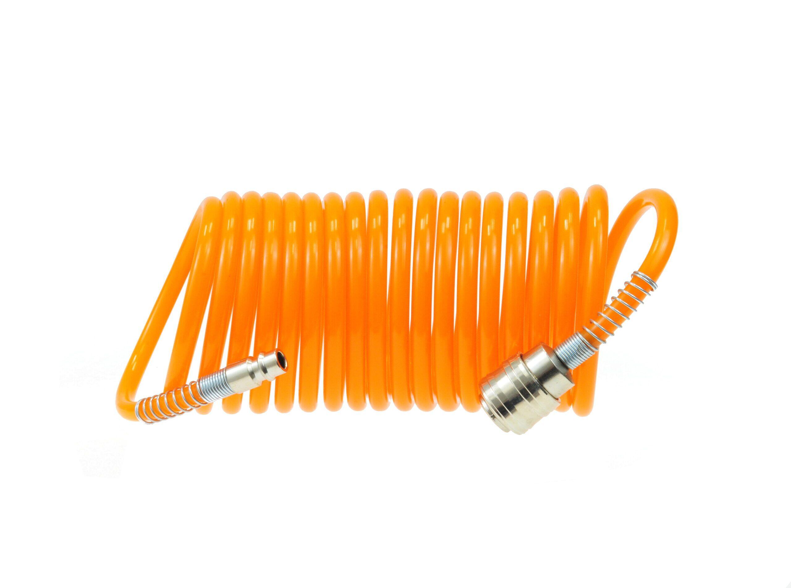 Polypropylene spiral hose for compressed air. The cable ends with a female quick connector and a male plug, so you can connect any pneumatic device to it. Essential for working with any compressor.