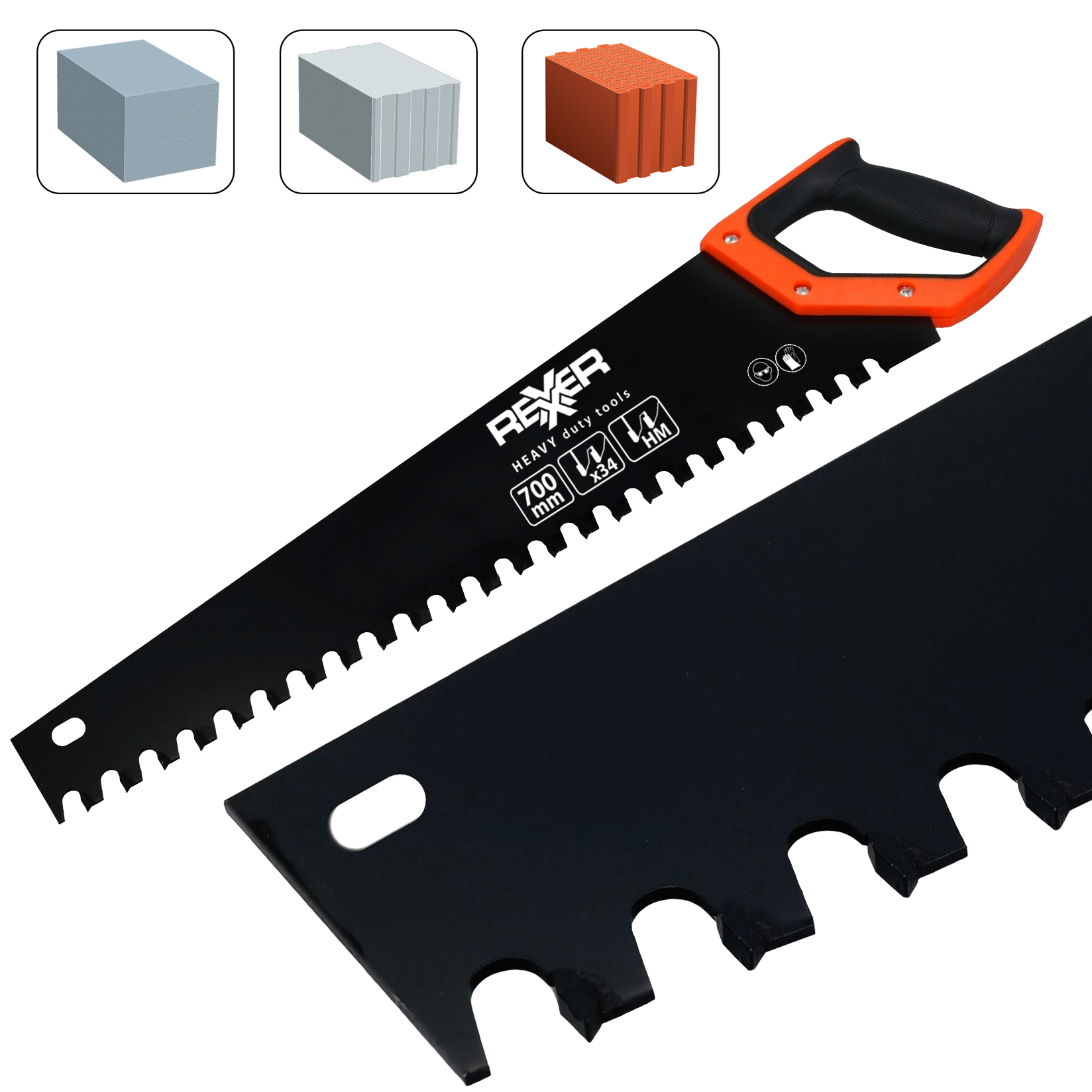 A hand-held aerated concrete saw is a tool designed for cutting aerated concrete blocks, such as Ytong, Silka or Thermopor. The saw consists of a saw blade made of hardened steel, which is equipped with carbide teeth (HM). These teeth are long and densely spaced, allowing for easy and quick cutting of material. The saw also has an ergonomic handle made of plastic, which ensures comfort and safety while working. The handle is adjusted to fit the hand, so the saw fits well in the hand and does not slip out. A hand saw for aerated concrete is a universal tool that can be used to cut many construction elements. It allows you to cut at different angles, which is useful when doing different construction jobs. The saw is simple to use and does not require any special skills.