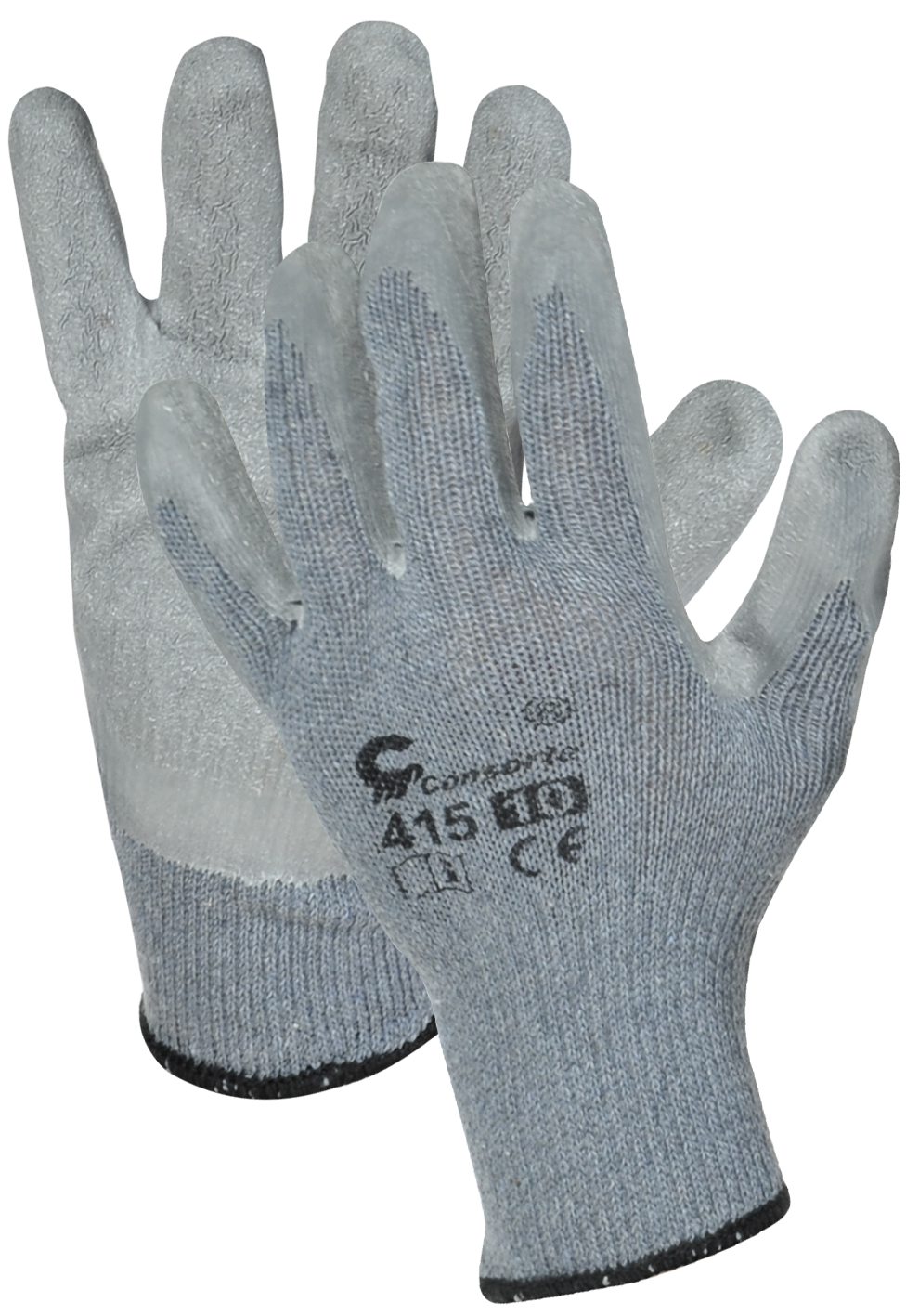 Work glove coated with rough, crinkled latex. The back side of the hand provides air, there is a welt at the wrist.