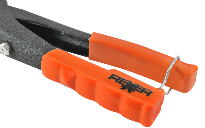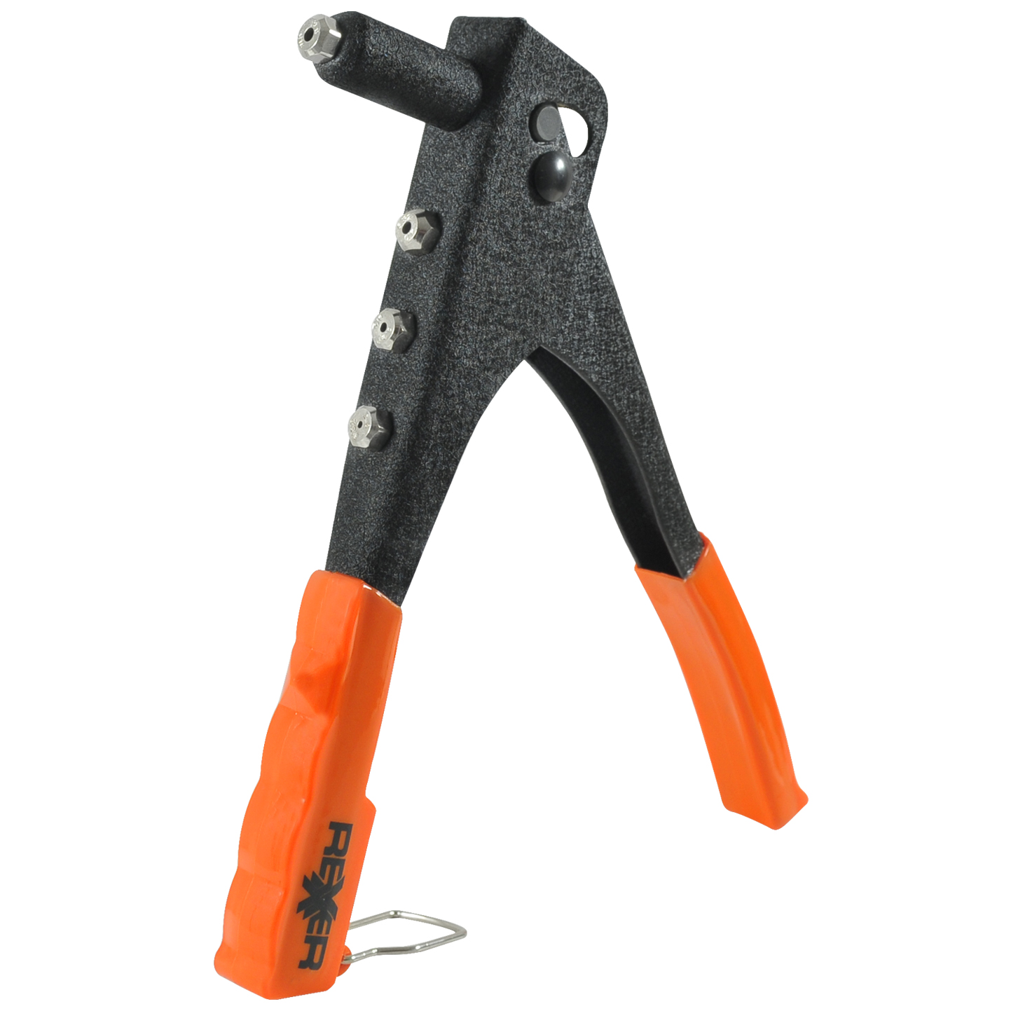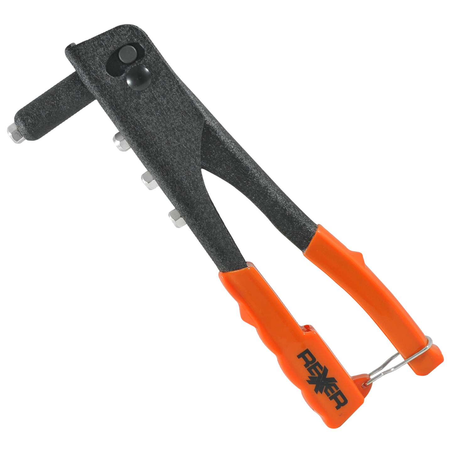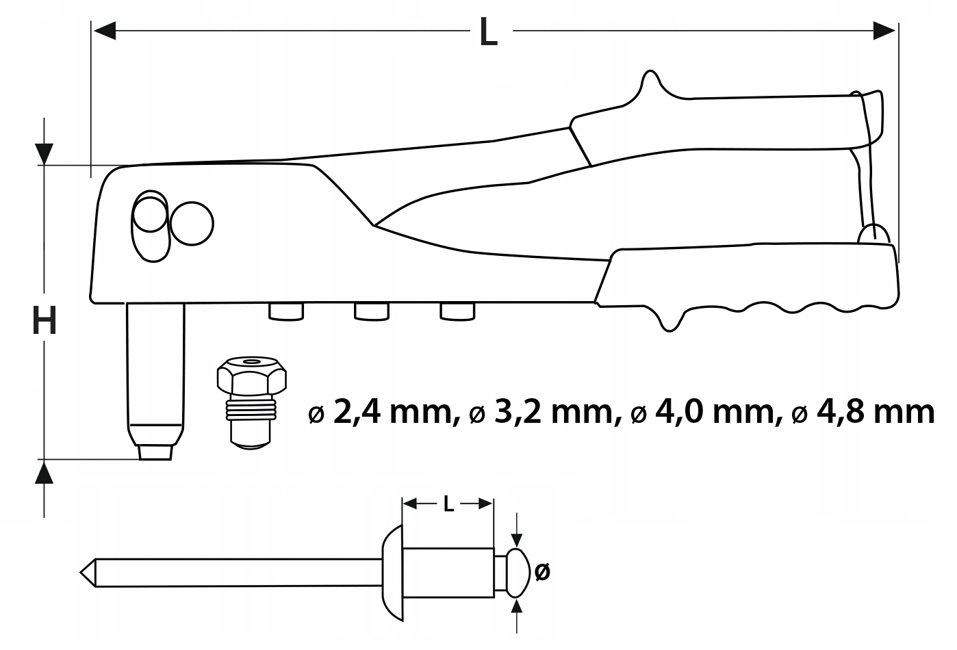 Manual riveting machine designed for aluminum rivets. Thanks to the tool, we can easily and quickly combine various materials: leather, plasterboard, sheets, girders, brackets, machine elements, plastic elements, various types of fabrics. The tool allows the use of rivets of the following sizes: 2.4, 3.2, 4.0, 4.8 mm. Adapters for different diameters are conveniently stored on the tool body. Thanks to this, they are always at hand.