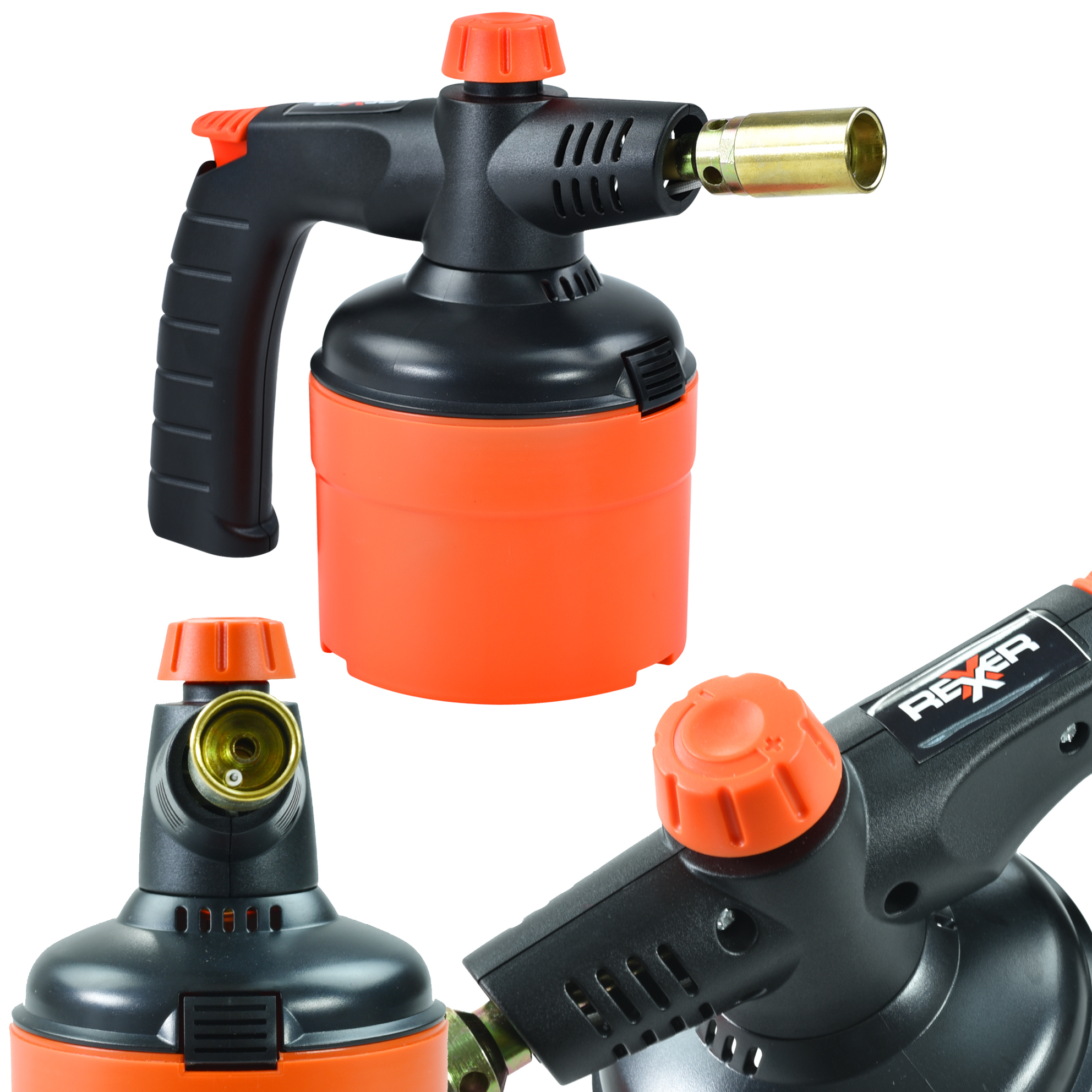 This gas burner is a versatile tool for heating various elements. It consists of a metal body with a torch and a handle that makes it easy to hold the device during operation. The burner is powered by gas from pierced cartridges, which makes it very practical to use, especially where there is no access to the gas network.