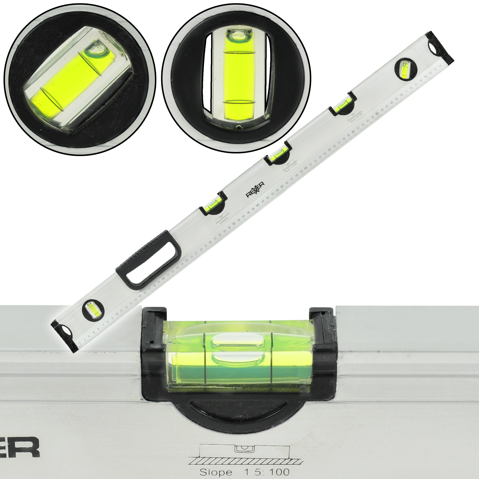 The pro special aluminium spirit level is a measuring tool used mainly in construction, renovation and carpentry to check the level and vertical of surfaces and structural elements. It is a simple but extremely precise instrument that allows you to accurately position objects horizontally (horizontally) and vertically (vertically). The spirit level is made of aluminum. Aluminum is lightweight for easy transport and handling, yet strong enough to ensure tool durability. The spirit levels are equipped with 5 vials (leveling bubbles) filled with liquid. The vials are placed in various positions (horizontal, vertical, at an angle of 45 degrees, as well as deviations from the horizontal of 1.5mm and 3.5mm per 100 cm). The length of the spirit level matters. Shorter spirit levels are more handy and ideal for smaller jobs, while longer ones are more precise over longer distances. Spirit levels are used for positioning and aligning structures, walls, posts, beams and other building elements, assembling cabinets, shelves, paintings, tiles and other decorative elements, as well as for precise alignment of wooden elements, e.g. in furniture construction.