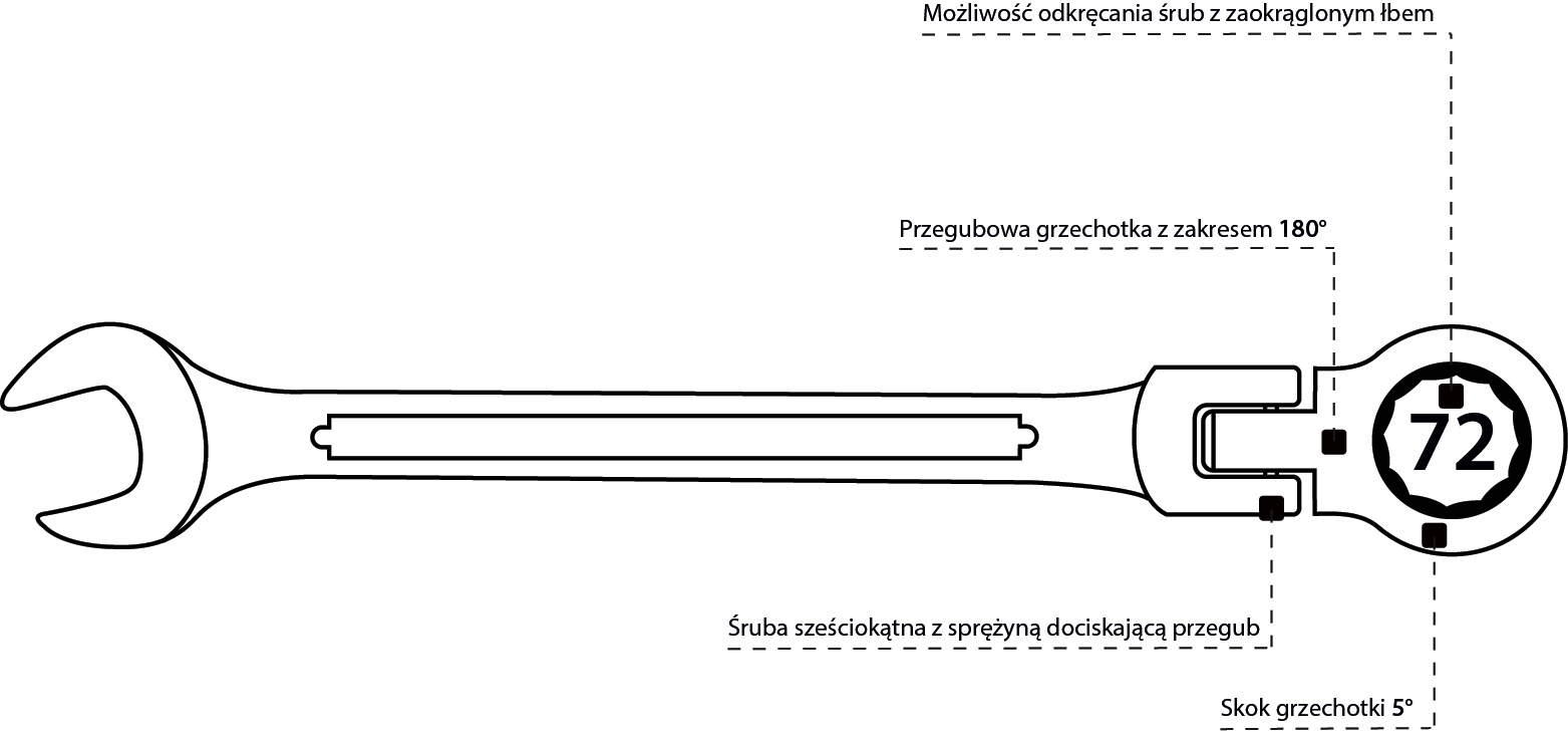 Oczko z grzechotką w tym kluczu posiada specjalną końcówkę, która umożliwia odkręcenie śruby nawet z uszkodzonym lub zaokrąglonym łbem. Przegubowa grzechotka z zakresem ruchu 180 stopni zapewnia wyjątkową elastyczność i swobodę działania, co znacznie ułatwia pracę w ciasnych przestrzeniach.