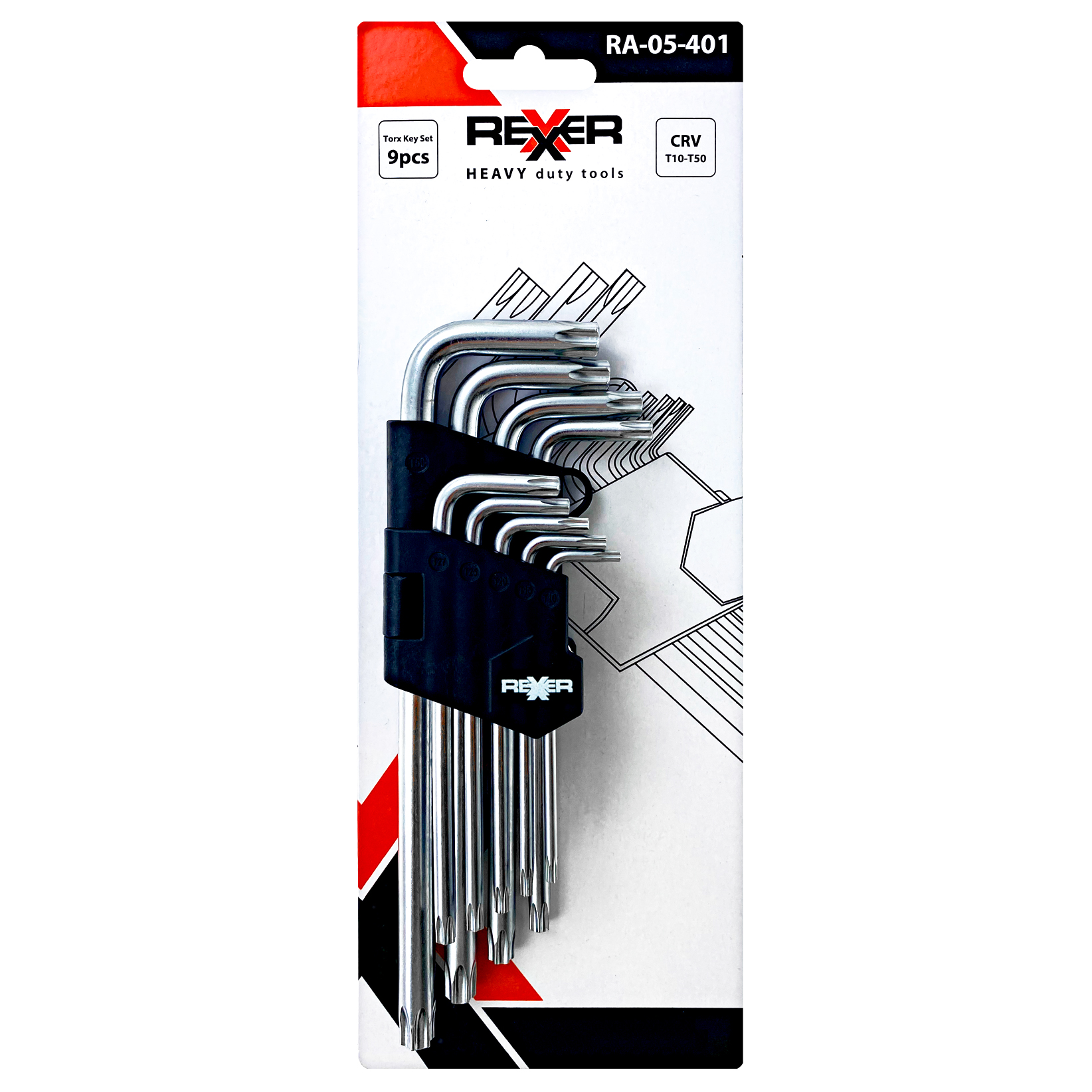 Klucze Torx z Otworem Długie T10-T50, 9 sztuk REXXER