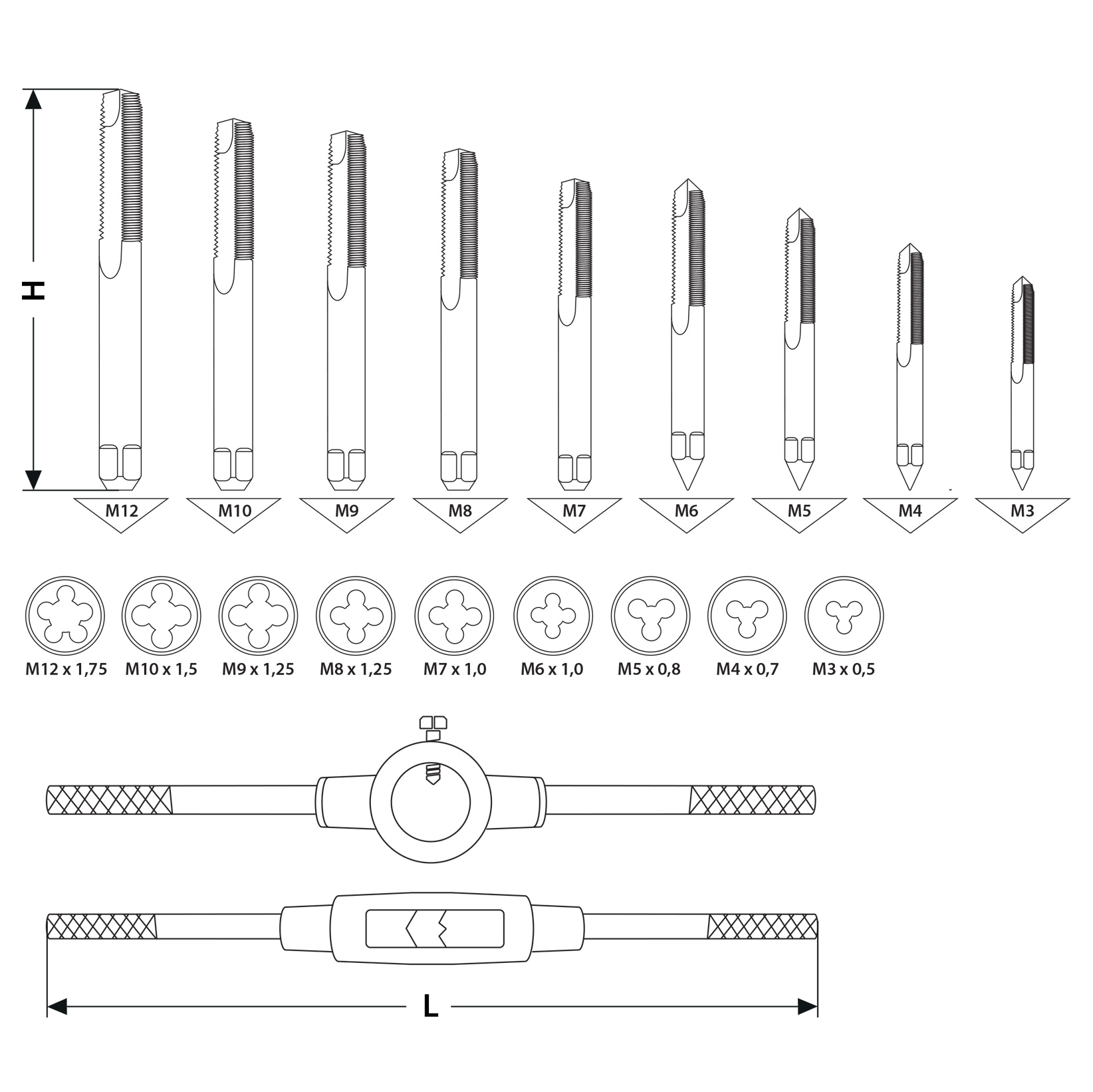 • Gwintowniki: 9 sztuk (M3, M4, M5, M6, M7, M8, M9, M10, M12)