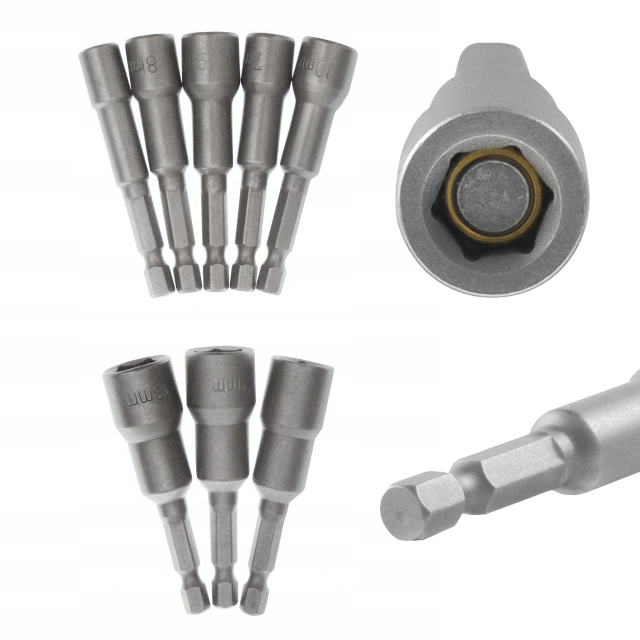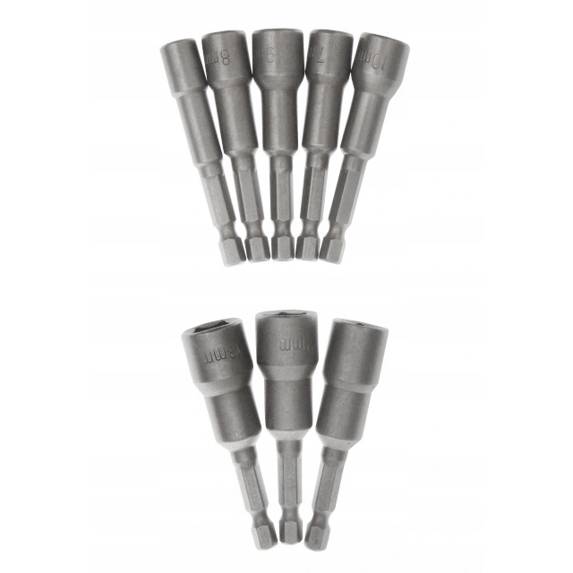 Każda nasadka wykonana jest z wytrzymałej stali chromowo-wanadowej (CrV), co zapewnia doskonałą odporność na korozję, uszkodzenia i odkształcenia mechaniczne. Na jednym końcu nasadki znajduje się precyzyjnie wykonany sześciokątny otwór, który idealnie pasuje do standardowych końcówek śrub sześciokątnych. Na drugim końcu umieszczono silny magnes, który skutecznie przyciąga i utrzymuje metalowe elementy, takie jak śruby i wkręty. Dzięki temu rozwiązaniu, montaż i demontaż staje się znacznie łatwiejszy i bardziej efektywny, ponieważ magnes zapobiega wypadaniu elementów i ułatwia ich precyzyjne umieszczanie w otworach. Ten zestaw umożliwia szybkie i bezproblemowe mocowanie lub demontowanie śrub z różnych powierzchni i obiektów.