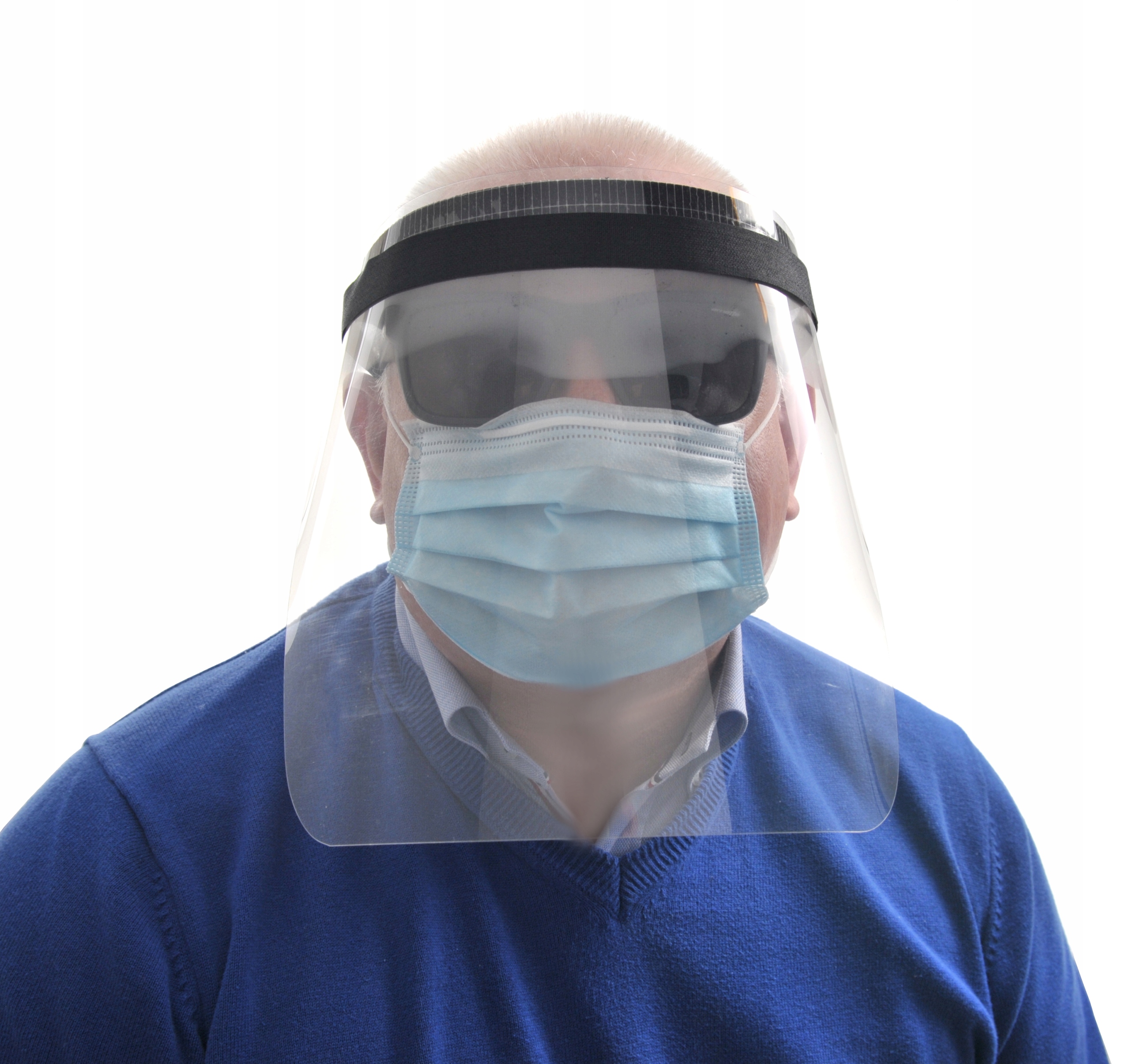 Przyłbica ochronna minimalizująca ryzyko zakażenia wirusami i bakteriami. Osłona na pasku z możliwością regulacji obwodu. Szybka została wykonana z przezroczystego tworzywa odpornego na środki dezynfekujące zawierające alkohol. Maska wielokrotnego użytku.