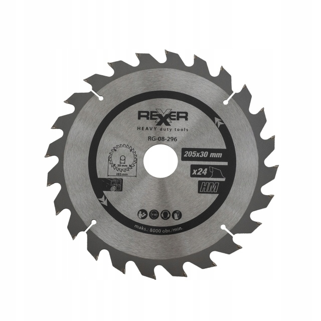 Wysokiej jakości piła tarczowa HM marki REXXER o średnicy 205 mm i otworze 30 mm z 24 zębami z węglikami spiekanymi. Idealna do cięcia drewna, drewna świeżego, płyt wiórowych i innych materiałów.
