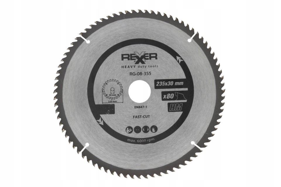 Wysokiej jakości piła tarczowa HM marki REXXER o średnicy 235 mm i otworze 30 mm z 80 zębami z węglikami spiekanymi. Idealna do cięcia drewna, drewna świeżego, płyt wiórowych i innych materiałów. Przeznaczona do szybkiego i precyzyjnego cięcia drewna twardego, miękkiego, płyt prasowanych, laminowanych, sklejek, płyt wiórowych, stolarki i płyt MDF.