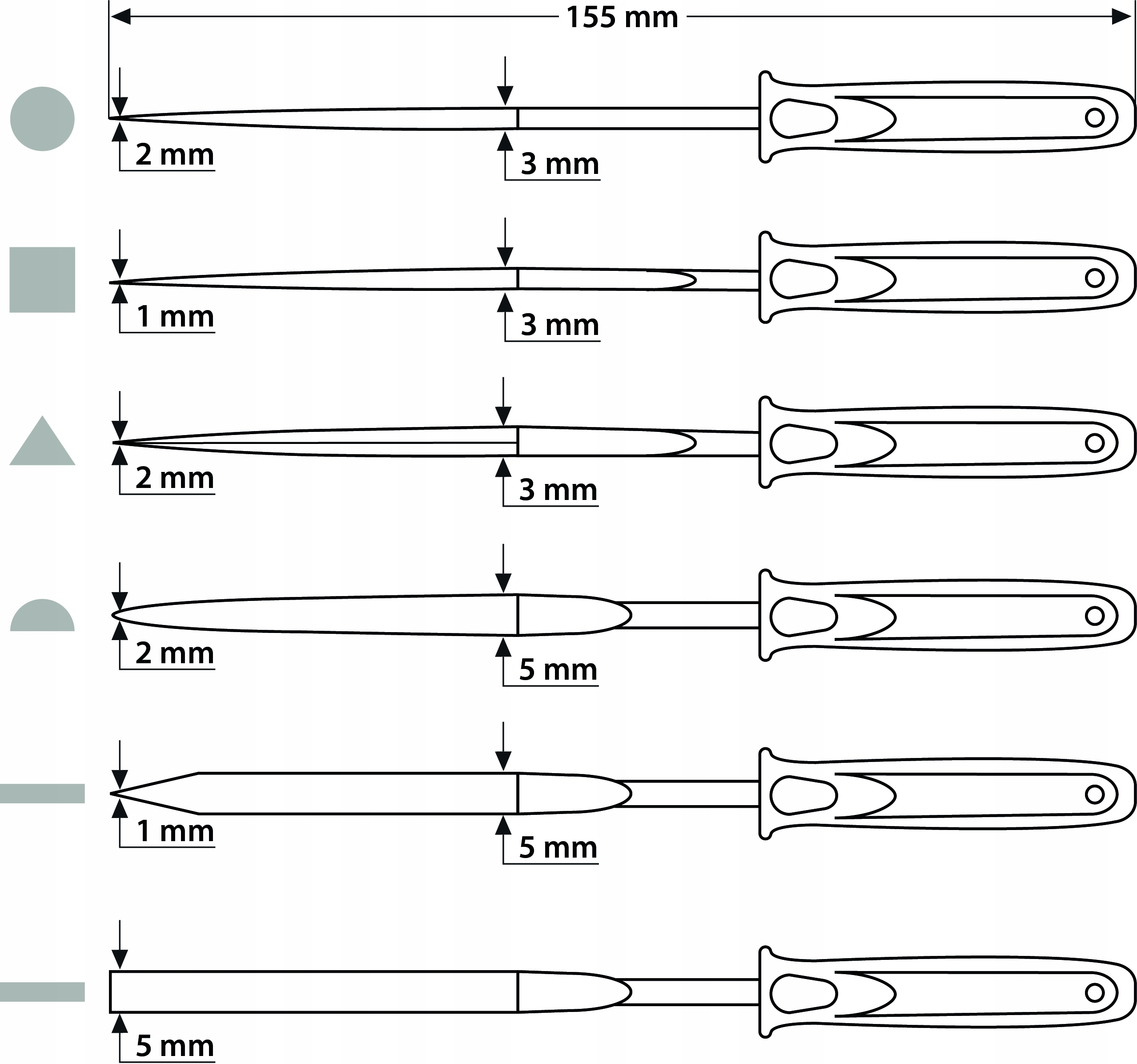 • Kształt pilnika: okrągły, półokrągły, kwadratowy, prostokątny, prostokątny i trójkątny