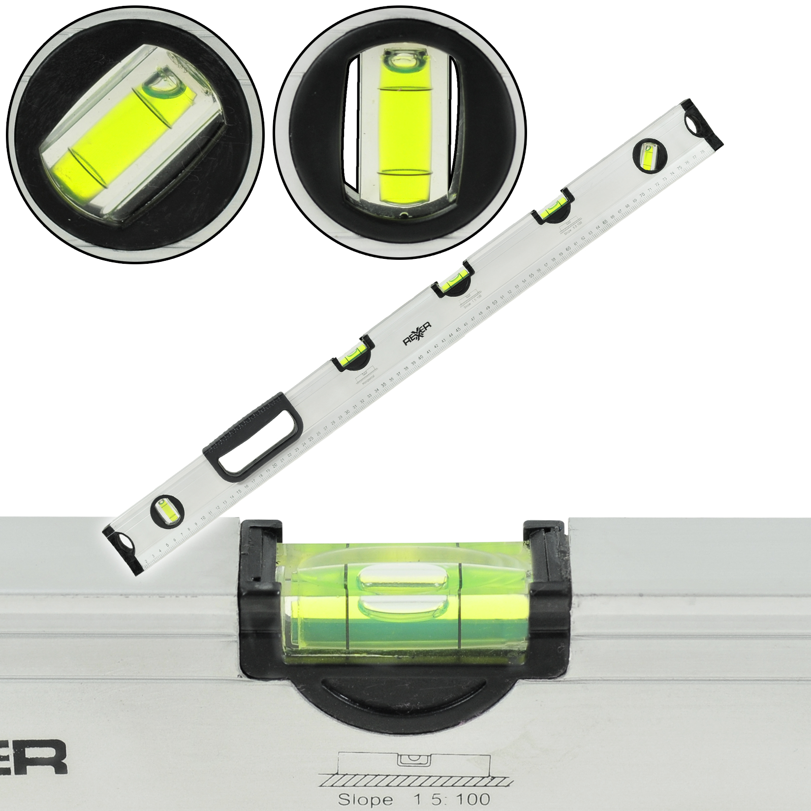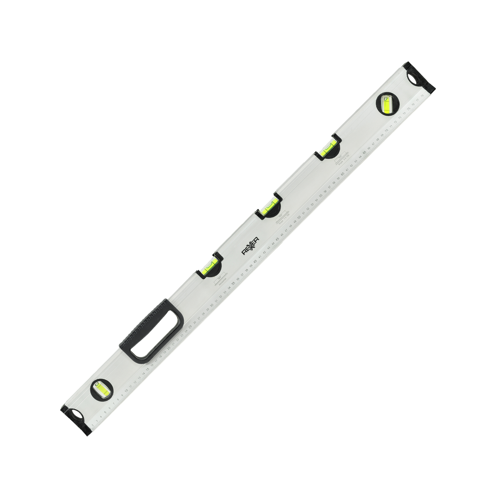 Poziomnica to narzędzie niezbędne podczas wykonywania wszelakich prac gdzie ustawienie płaszczyzn w poziomie i pionie jest najważniejsze, do tego posłuży nam poziomnica aluminiowa za pomocą której wytyczymy precyzyjnie poziom, pion, 45° a także odchylenia od poziomu 1.5mm i 3.5mm na 100 cm. Służą do tego libelki których zielonkawe zabarwienie ułatwia obserwację wychyleń pęcherzyka powietrza. Uchwyt pozwala na pewny chwyt poziomnicy.