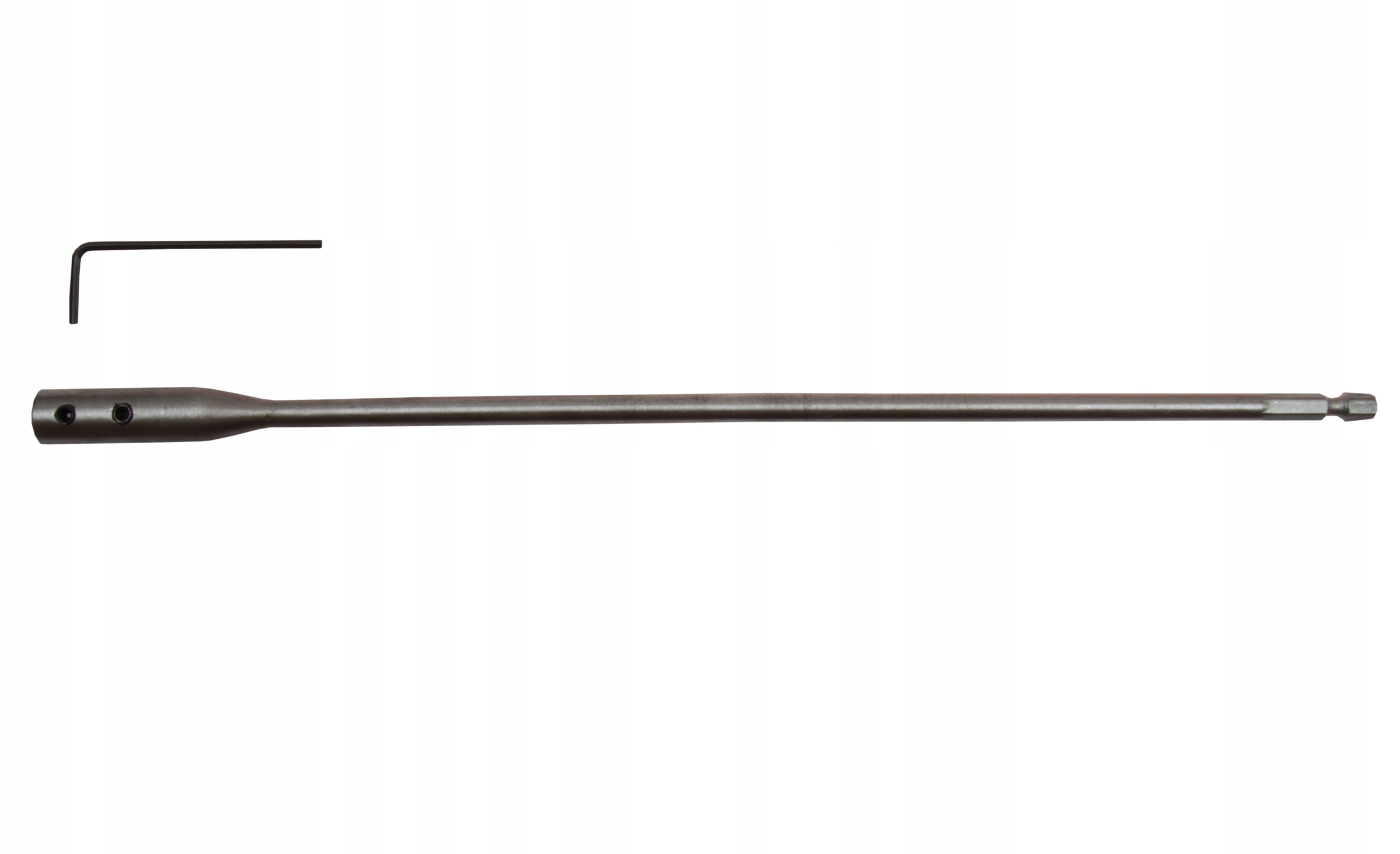 Przedłużka do wierteł łopatkowych znacząco zwiększa zakres pracy wiertła. Wykonana ze stali CrV, posiada zabezpieczenie w postaci dwóch śrub mocujących wiertło, co chroni przed niekontrolowanym rozłączeniem wiertła z przedłużką.