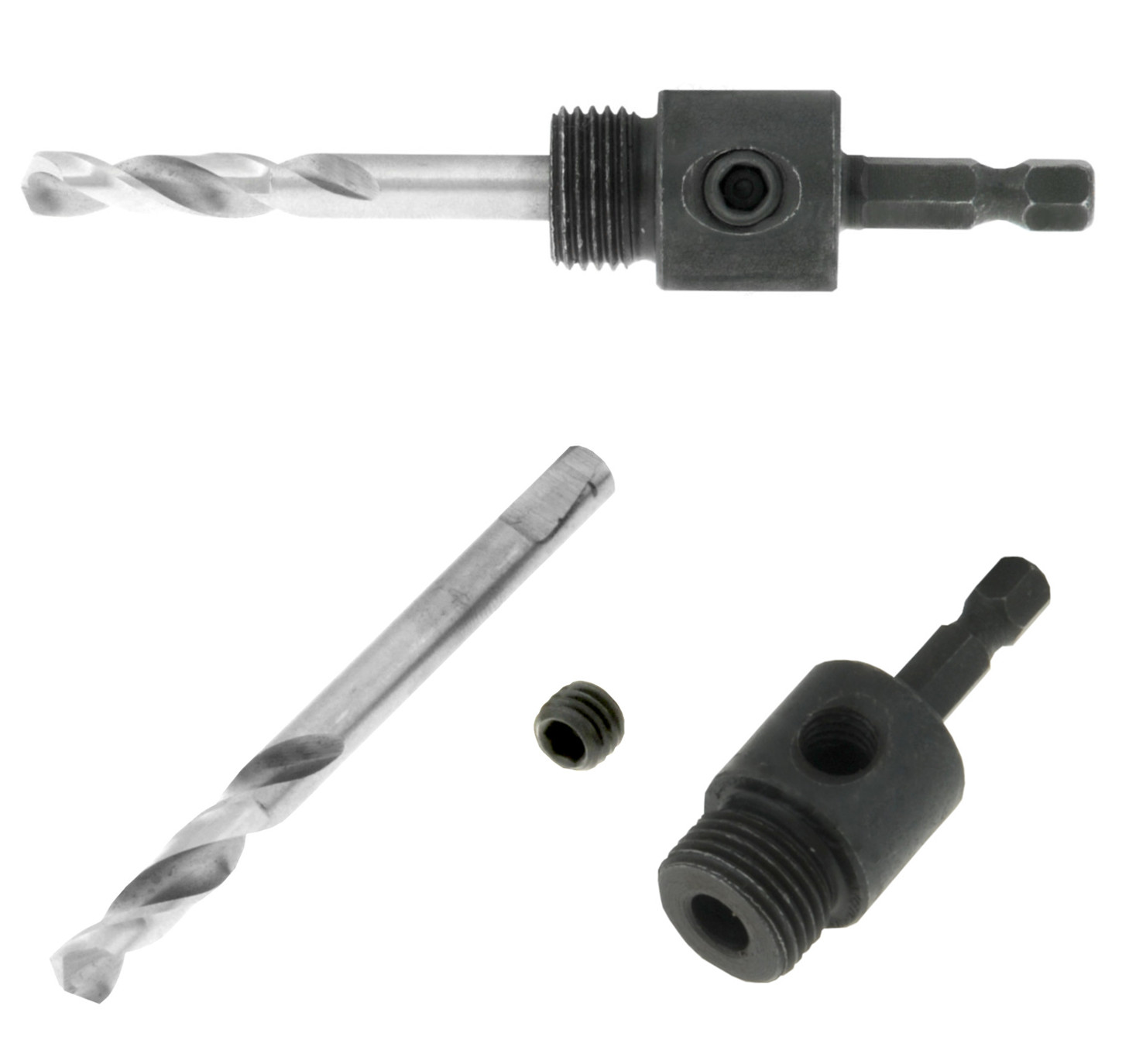 Adapter jest wykonany z trwałego stopu metali, co zapewnia niezawodność i długotrwałe użytkowanie, nawet w trudnych warunkach pracy. Posiada wiertło pilotujące, które ułatwia precyzyjne ustawienie otworu, oraz śrubę kontrującą wiertło pilotujące, która zabezpiecza przed przesuwaniem się otwornicy podczas pracy. Dzięki temu adapter zapewnia nie tylko precyzję, ale także bezpieczeństwo podczas wiercenia.