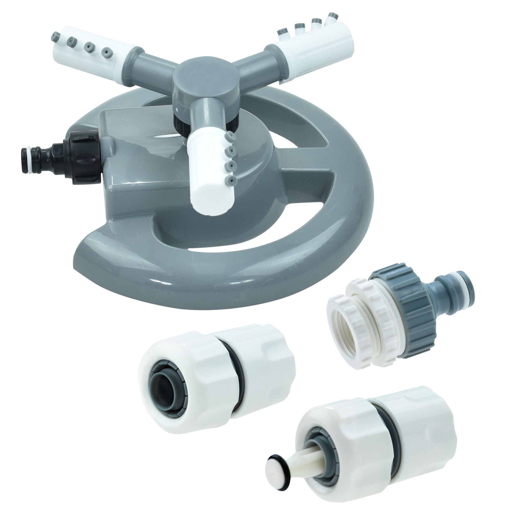 Zraszacz obrotowy na podstawie 3-ramiennej to urządzenie ogrodowe przeznaczone do równomiernego nawadniania dużych powierzchni trawnika lub ogrodu. Składa się z kilku kluczowych elementów: podstawy, obrotowej głowicy i ramion z dyszami. Podstawa w kształcie trójkąta zapewnia stabilność zraszacza na różnych rodzajach podłoża. Dzięki trzem ramionom, zraszacz stoi pewnie nawet na nierównej powierzchni. Na szczycie podstawy znajduje się głowica, która obraca się wokół własnej osi pod wpływem ciśnienia wody. Obrotowy mechanizm może działać dzięki turbinie napędzanej przez przepływającą wodę. Z głowicy wychodzą trzy ramiona, na końcach których znajdują się dysze rozpylające wodę. Ramiona te obracają się, tworząc efekt wirowania wody.