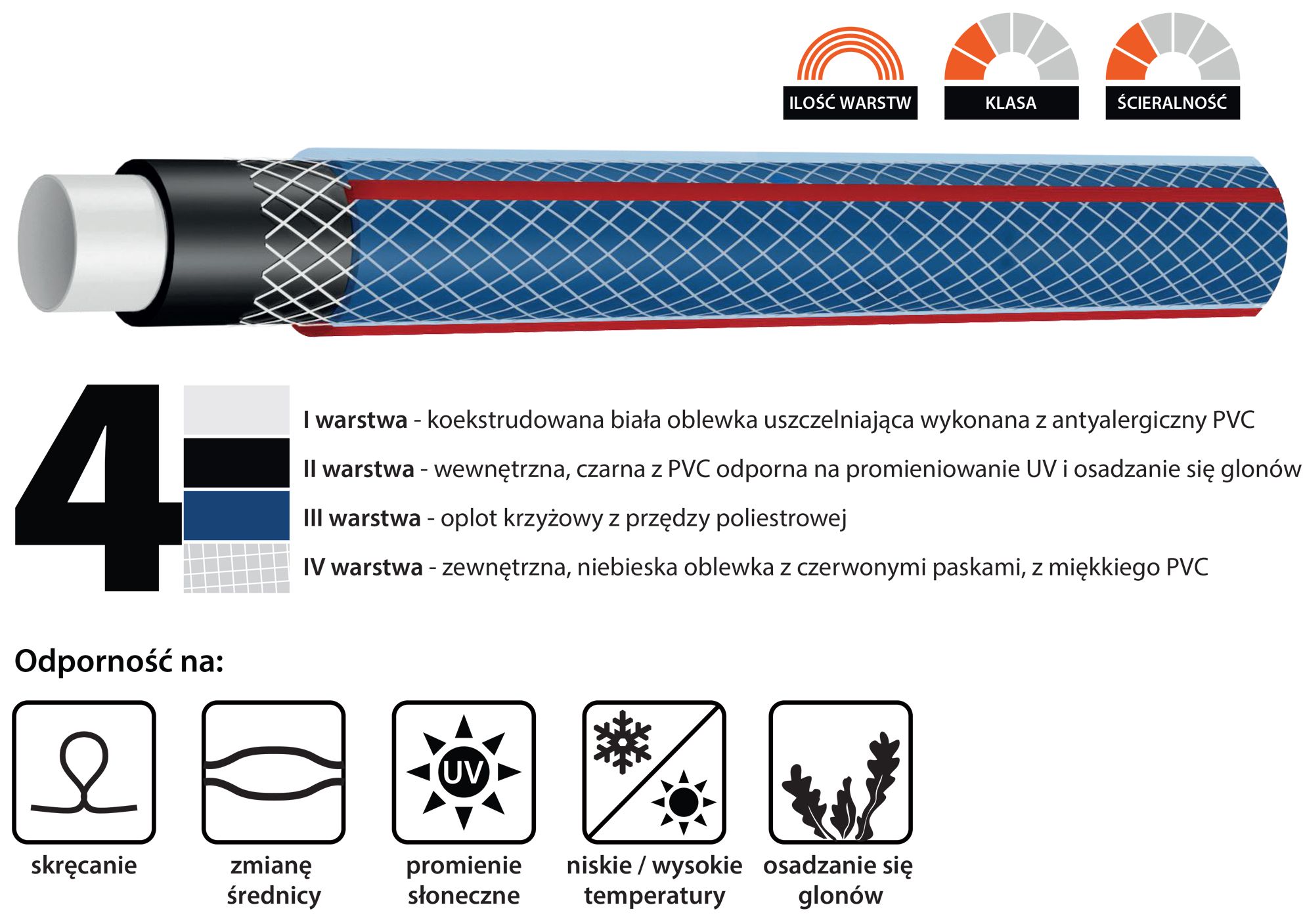 4-warstwowy wąż ogrodowy pozwala na swobodne podlewanie ogrodu lub działki. Składa się on z czterech warstw: wewnętrznej warstwy, która zapobiega powstawaniu zanieczyszczeń i osadów, wzmocnionej siatką warstwy, która zwiększa wytrzymałość węża, trzeciej warstwy z termoplastycznej gumy, która chroni przed działaniem wysokiej temperatury i szkodliwych czynników atmosferycznych, oraz zewnętrznej warstwy z materiału odpornego na ścieranie. Dzięki temu, wąż jest bardzo odporny na uszkodzenia i trwały w użytkowaniu. Dodatkowo, jego wzmocniona konstrukcja pozwala na swobodne przemieszczanie się bez ryzyka uszkodzeń lub pęknięć. Jego wytrzymałość i elastyczność sprawiają, że jest to idealne narzędzie dla miłośników ogrodów, którzy często korzystają z węża ogrodowego. Dzięki swojej konstrukcji, wąż ten jest odporny na zginanie i skręcanie, co pozwala na wygodne podlewanie z każdej strony. Dzięki zastosowaniu specjalnych materiałów, jest odporny na działanie promieni UV, co pozwala na długi okres użytkowania bez ryzyka utraty właściwości. Produkt został wyprodukowany w Polsce.