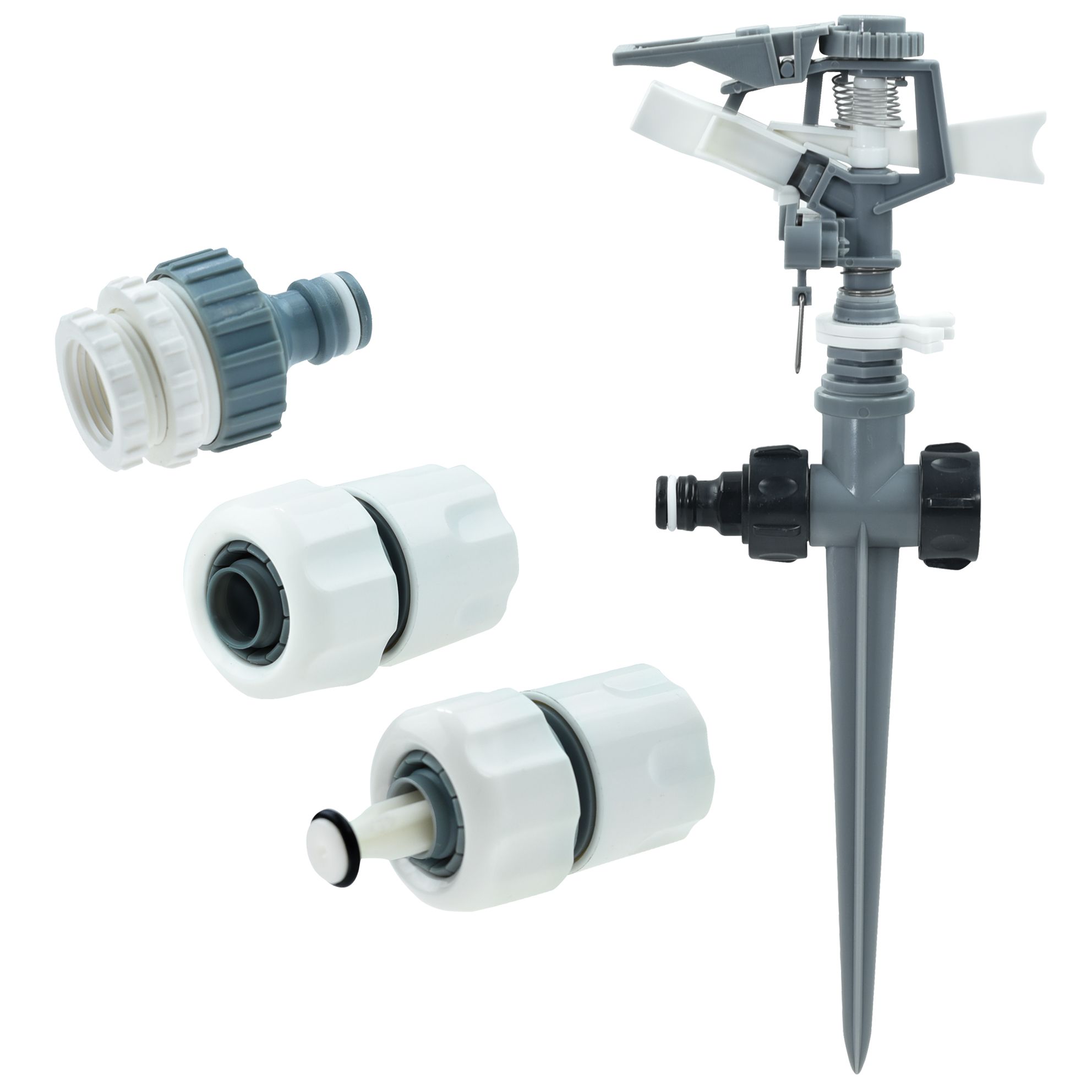 Wysokiej jakości szybkozłączki, jedna wyposażona w system STOP, pozwalające w łatwy i szybki sposób na przyłączanie i odłączanie urządzeń zraszających oraz węża do kranu. System STOP pozwala na natychmiastowe zatrzymanie wody podczas odłączania zraszacza. Złączki posiadają wyprofilowane ząbki, które pozwalają na solidne zamocowanie końcówki na końcu węża 1/2″. Szybkozłączki zapewniają szczelne połączenie, dzięki czemu woda nie wycieka na zewnątrz. Są kompatybilne ze wszystkimi złączkami dostępnymi na rynku.