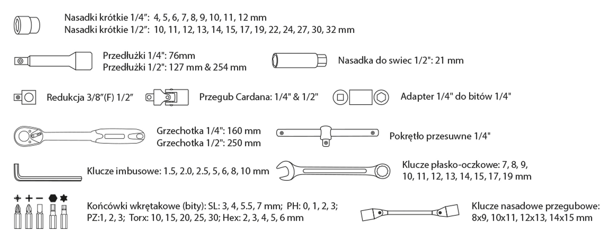 • Nasadki 1/4″: 4, 5, 6, 7, 8, 9, 10, 11, 12 mm