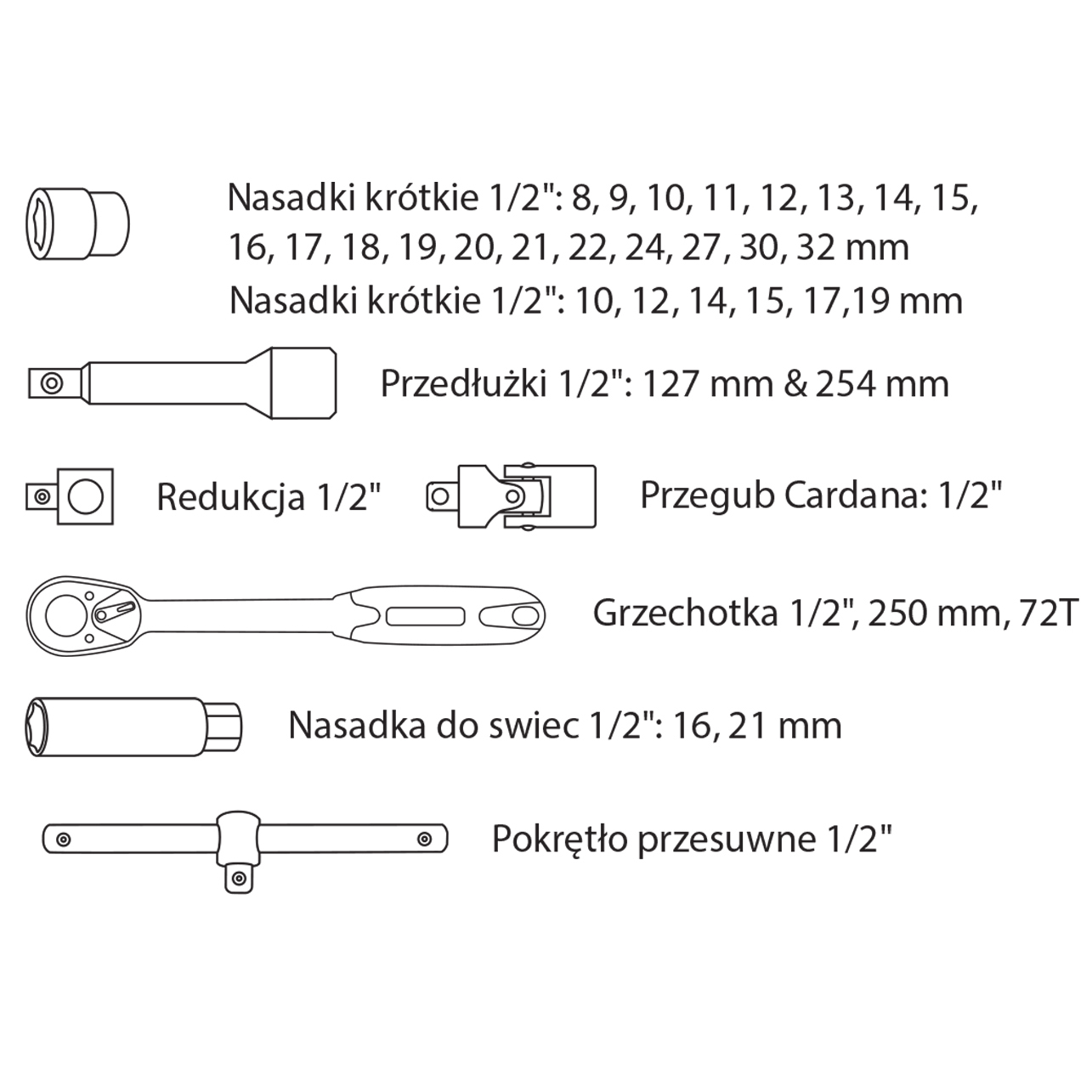 • Nasadki 1/2″: 8, 9, 10, 11, 12, 13, 14, 15, 16, 17, 18, 19, 20, 21, 22, 24, 27, 30, 32 mm