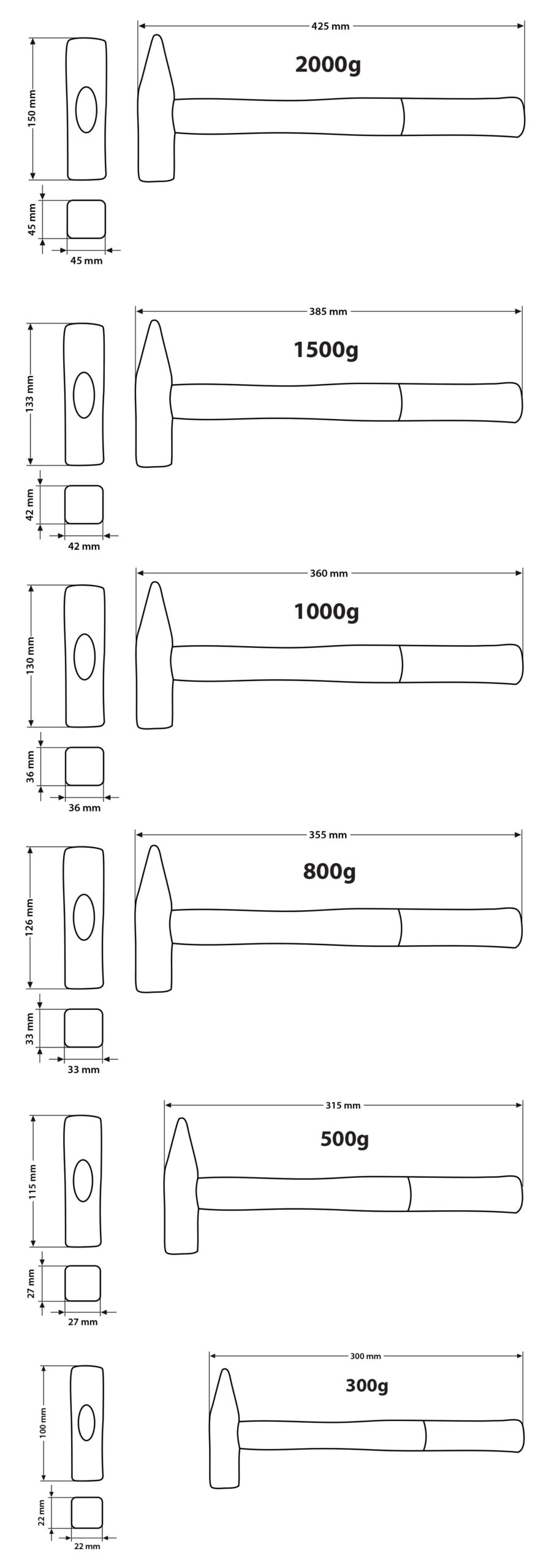 W skład zestawu wchodzi 6 młotków o wagach od 300 g do 2000 g, dzięki czemu łatwo dopasujesz odpowiednie narzędzie do rodzaju wykonywanej pracy.