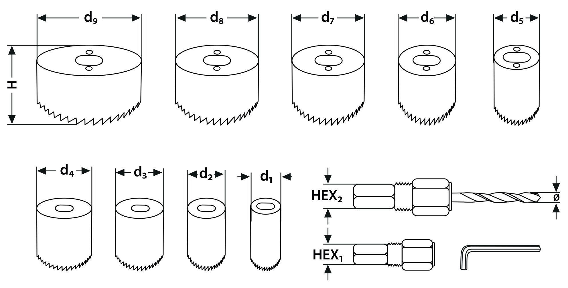 • 9x OTWORNICA: 19 mm, 22 mm, 28 mm, 38 mm, 44 mm, 51 mm, 60 mm, 67 mm, 82 mm