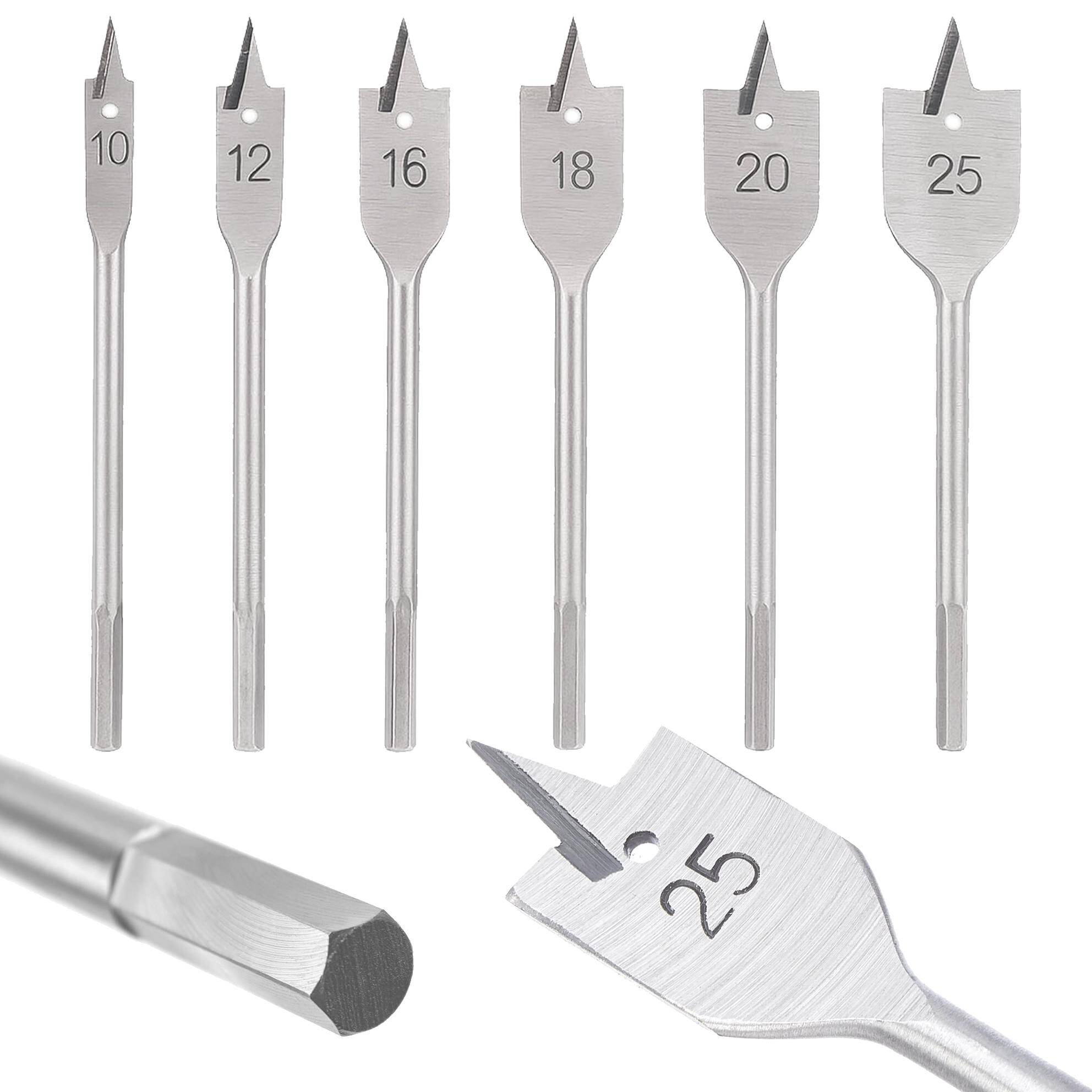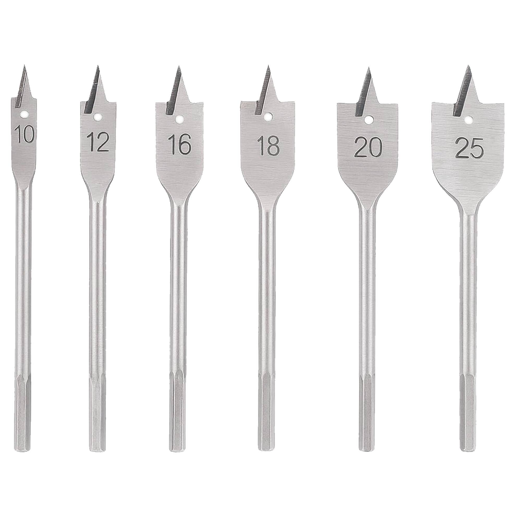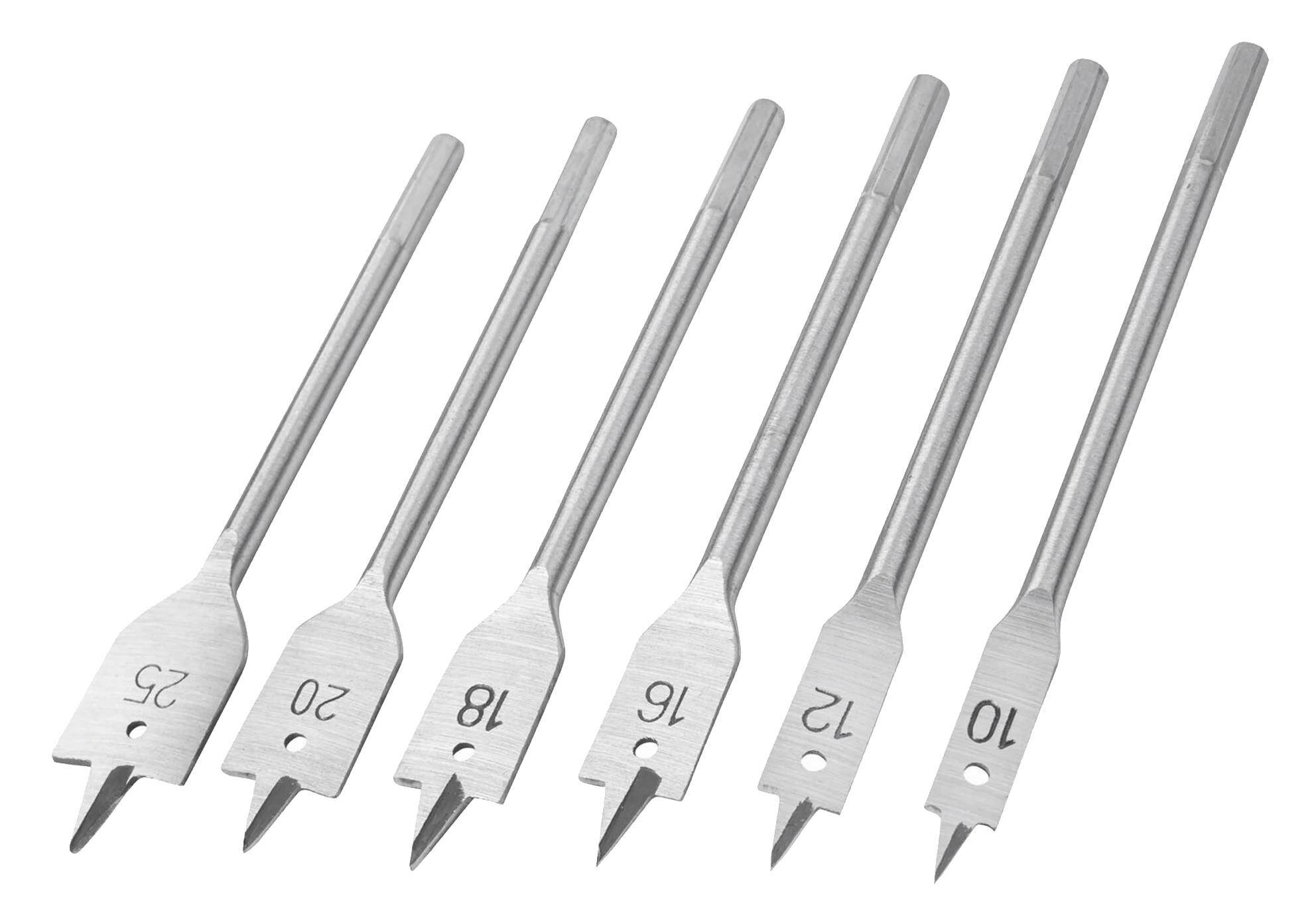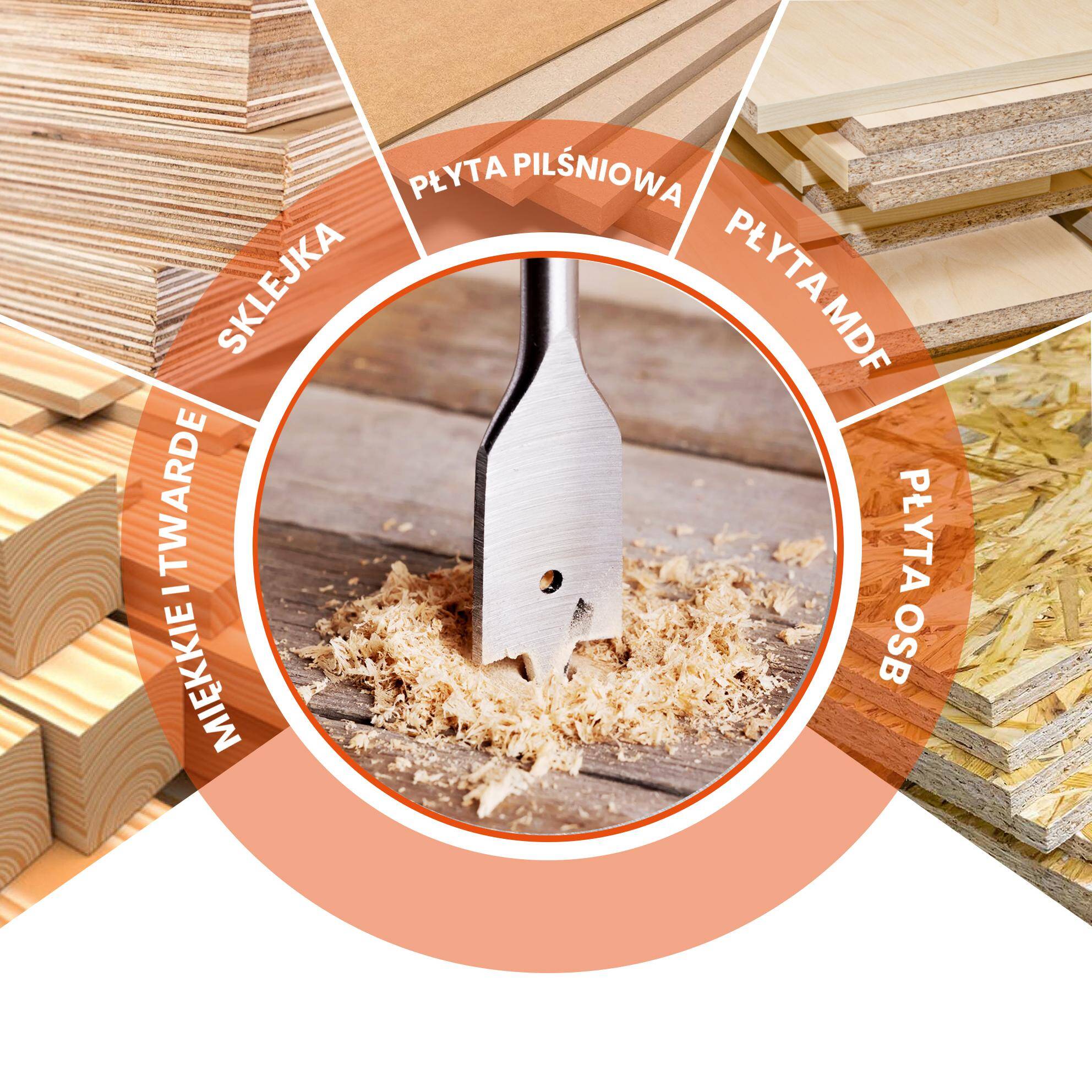 • Zestaw wierteł łopatkowych (inaczej: wiertła piórkowe) to narzędzie używane głównie do wiercenia otworów w drewnie oraz materiałach drewnopochodnych (np. sklejka, płyta wiórowa, MDF). Charakteryzują się płaskim, szerokim ostrzem z centralnym ostrzem prowadzącym, które pomaga w stabilizacji podczas wiercenia.