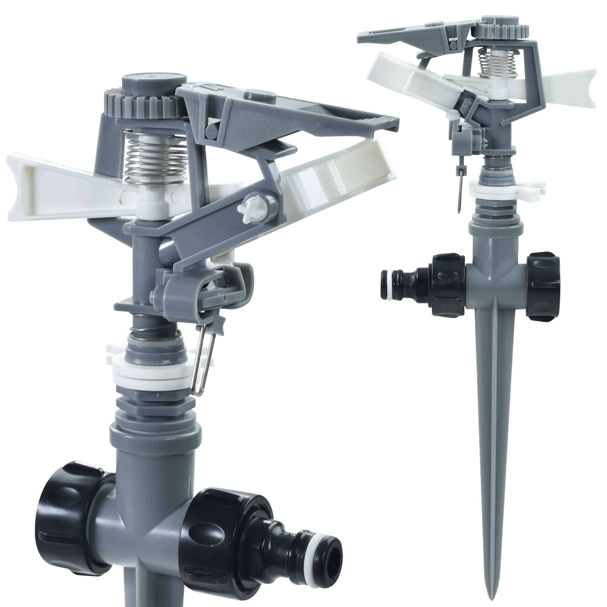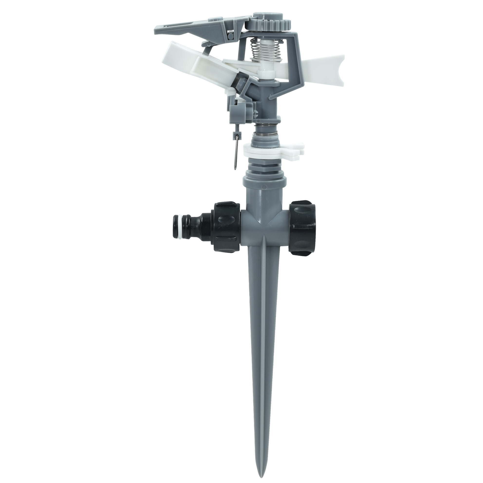 Zraszacz obrotowy wbijany pulsacyjny to ogrodowe urządzenie do nawadniania trawników, ogrodów i innych terenów zielonych. Jego konstrukcja i mechanizm działania zapewniają równomierne rozprowadzanie wody na dużej powierzchni, co czyni go efektywnym narzędziem do utrzymania wilgotności gleby.