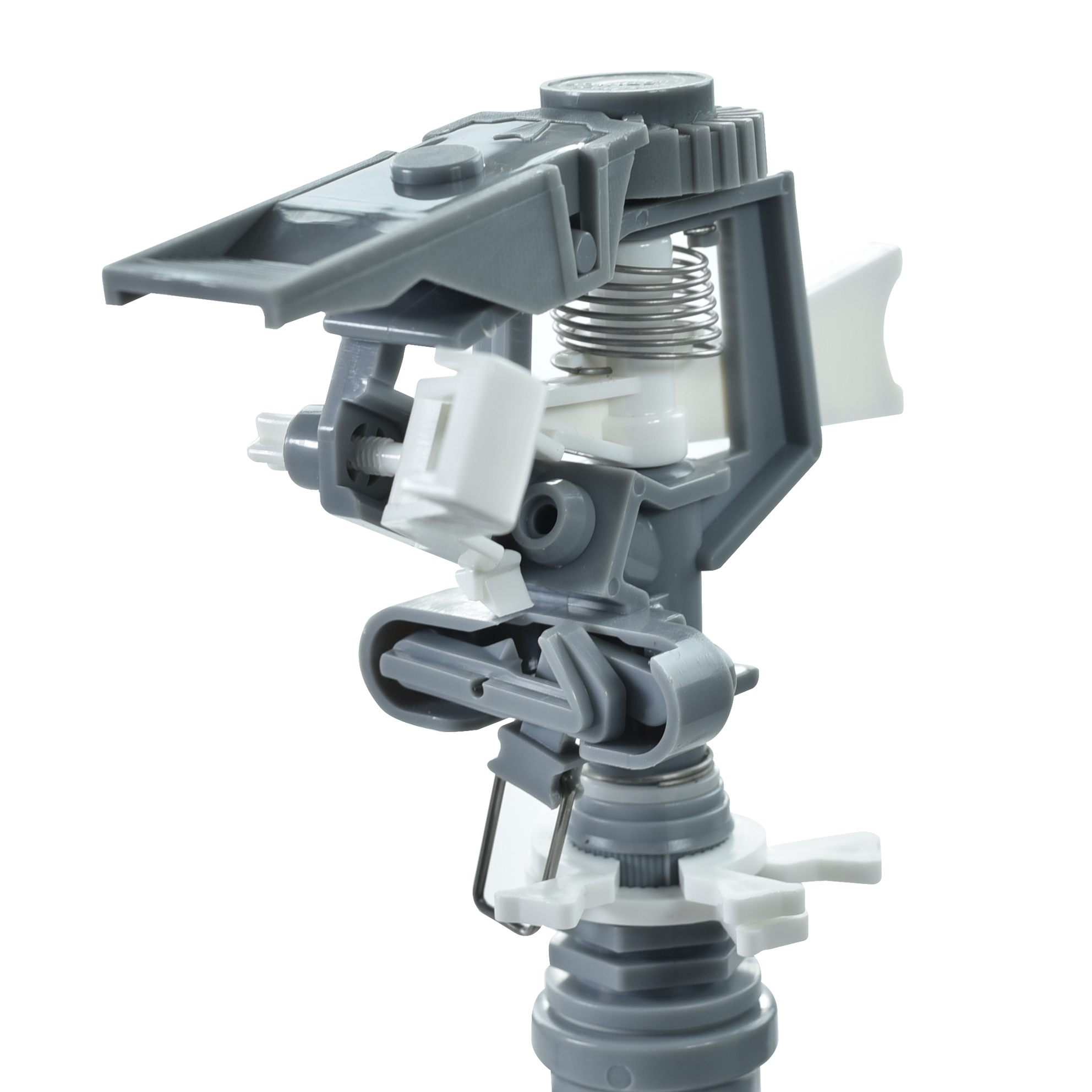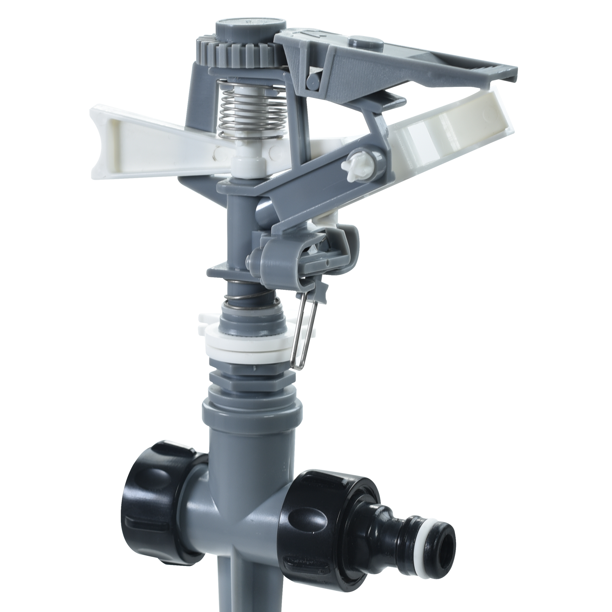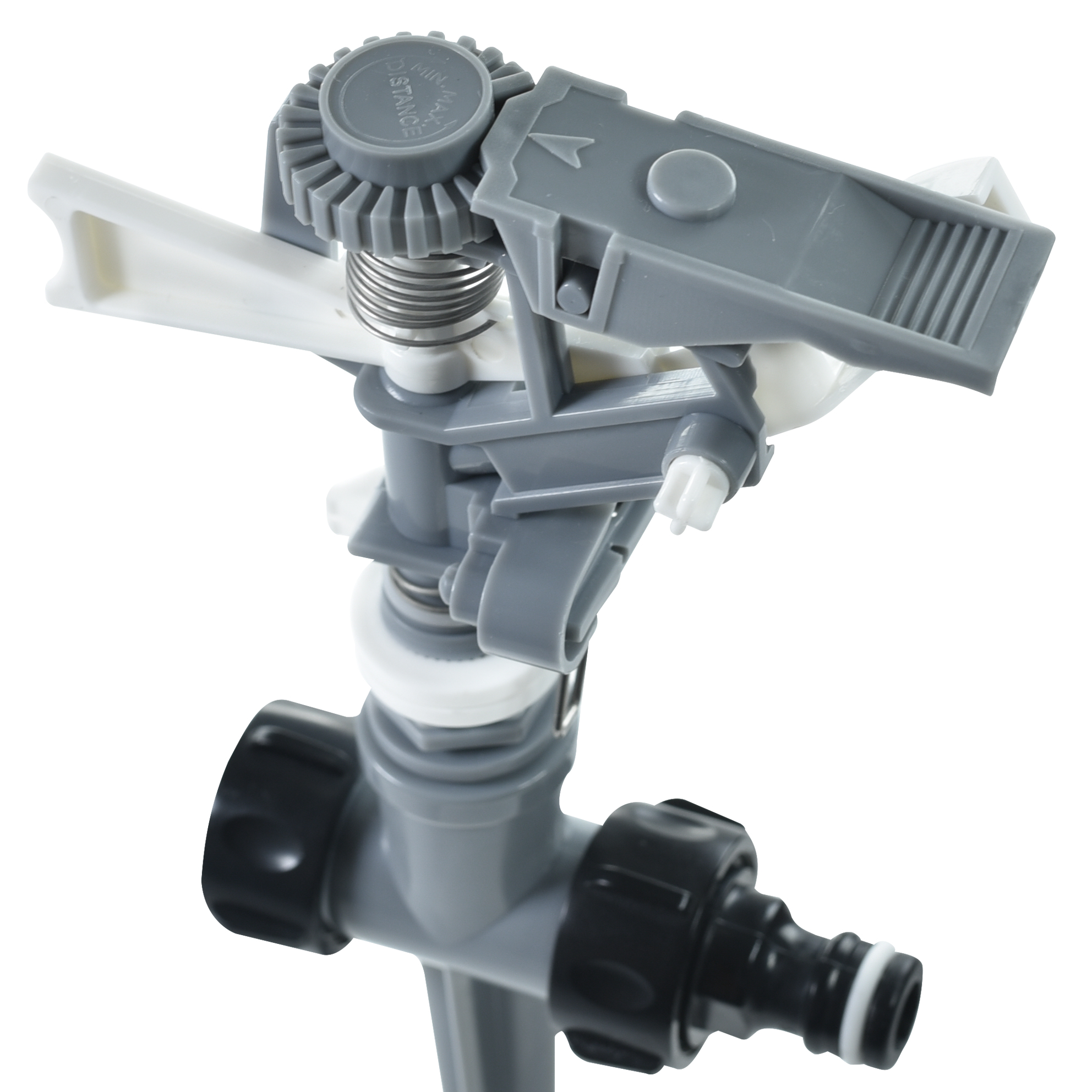 Zraszacz składa się z kilku kluczowych elementów, które wspólnie zapewniają efektywne i stabilne działanie: wbijanej podstawy, obrotowej głowicy i mechanizmu pulsacyjnego. Wyposażony jest w szpikulec, który umożliwia łatwe wbicie w ziemię, co zapewnia stabilność podczas pracy. Głowica zraszacza jest zamontowana na obrotowym ramieniu, które umożliwia ruch w zakresie 360 stopni, pozwalając na nawadnianie dużych obszarów. Woda jest wypuszczana w impulsach, tworząc charakterystyczne przerywane strumienie, które efektywnie rozprowadzają wodę na większą odległość. Możliwość ustawienia kąta zraszania od wąskiego strumienia po pełne 360 stopni pozwala precyzyjnie dostosować obszar nawadniania do specyficznych potrzeb ogrodu. Mechanizm pulsacyjny umożliwia oszczędne gospodarowanie wodą, dzięki precyzyjnemu rozprowadzaniu jej tam, gdzie jest najbardziej potrzebna. Wystarczy wbić zraszacz w ziemię i podłączyć do źródła wody. Prosta konstrukcja sprawia, że urządzenie jest łatwe w obsłudze i konserwacji.